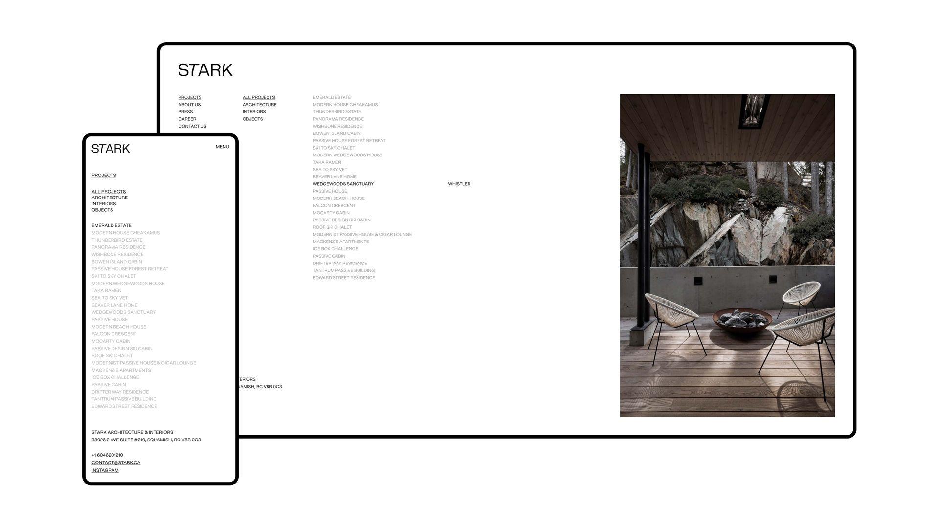STARK, архитектурная и дизайн-студия, базирующаяся в живописном городе Сквамиш, Канада, обратилась к нам за обновлением их текущего сайта. В дополнение к новой айдентике в качестве первого этапа внедрения бренда мы разработали сайт. Выполненный в соответствии с эстетикой минимализма, он отражает основные ценности бренда, методологию, портфолио и, прежде всего, знакомит нас с командой STARK.
