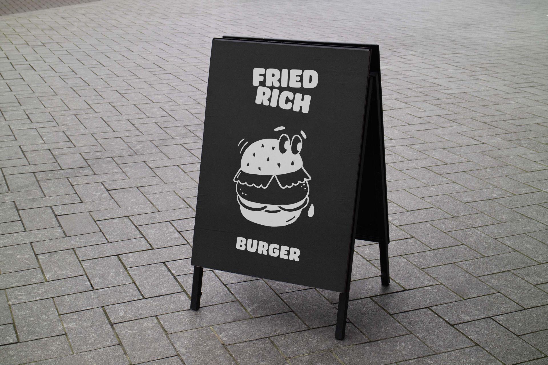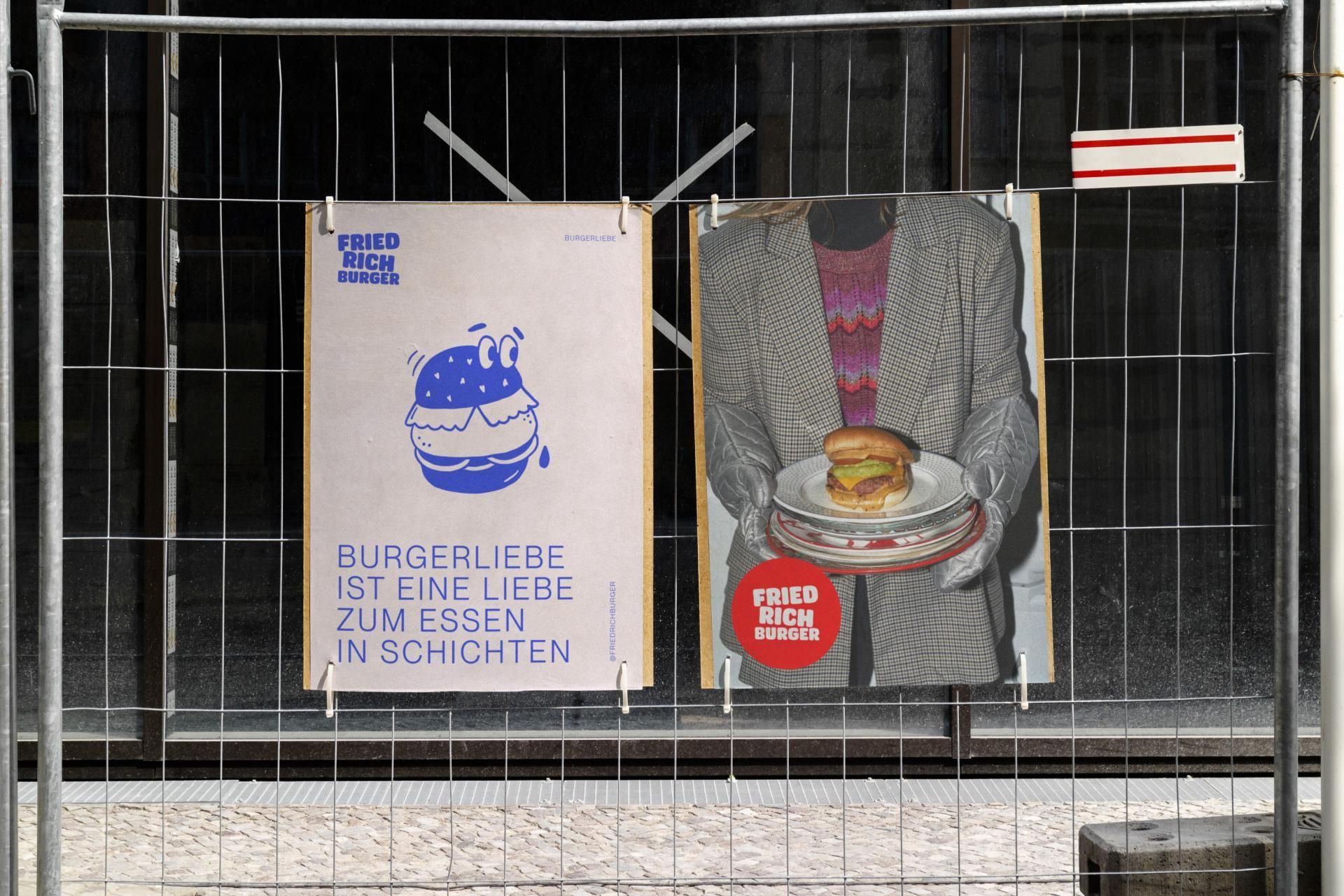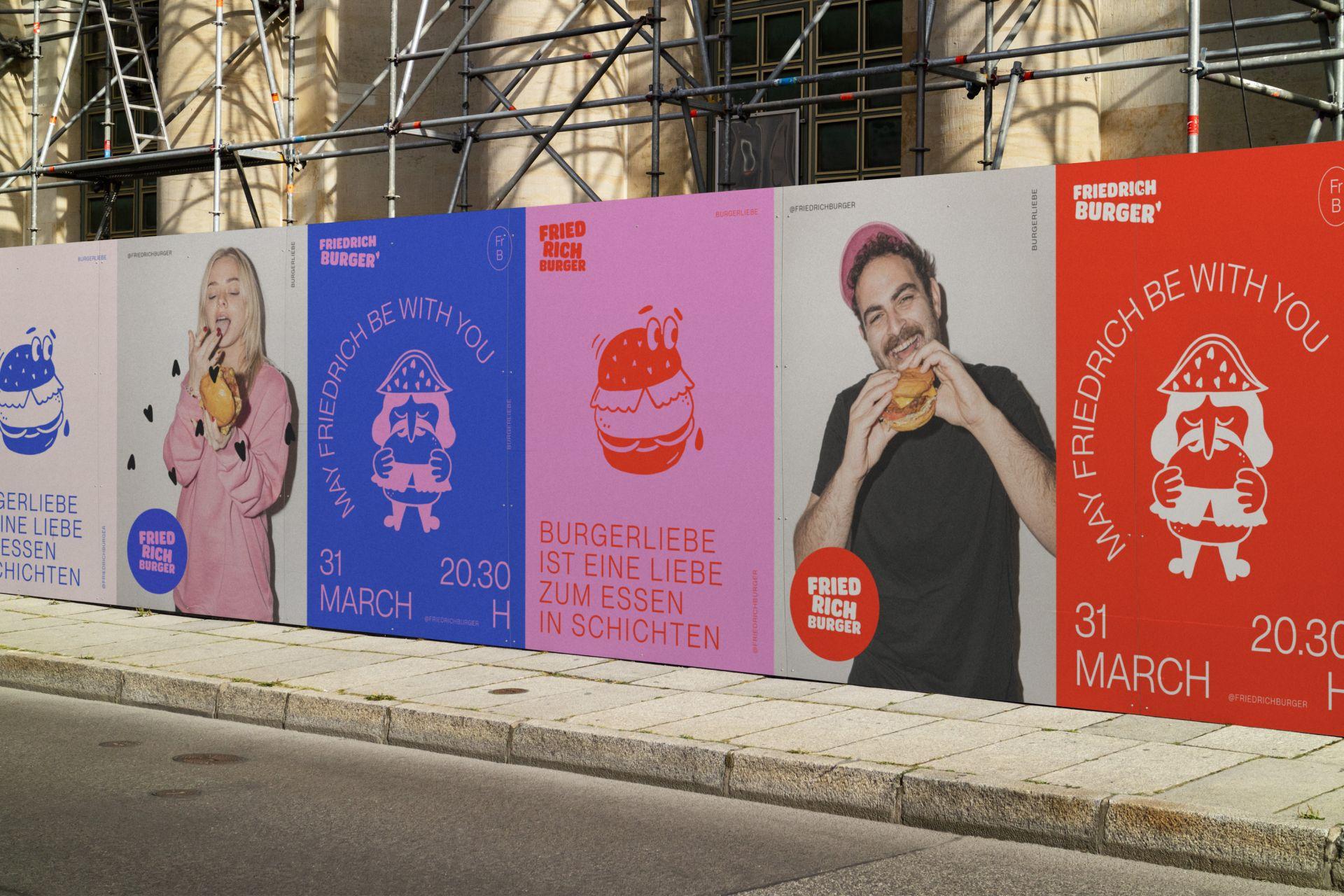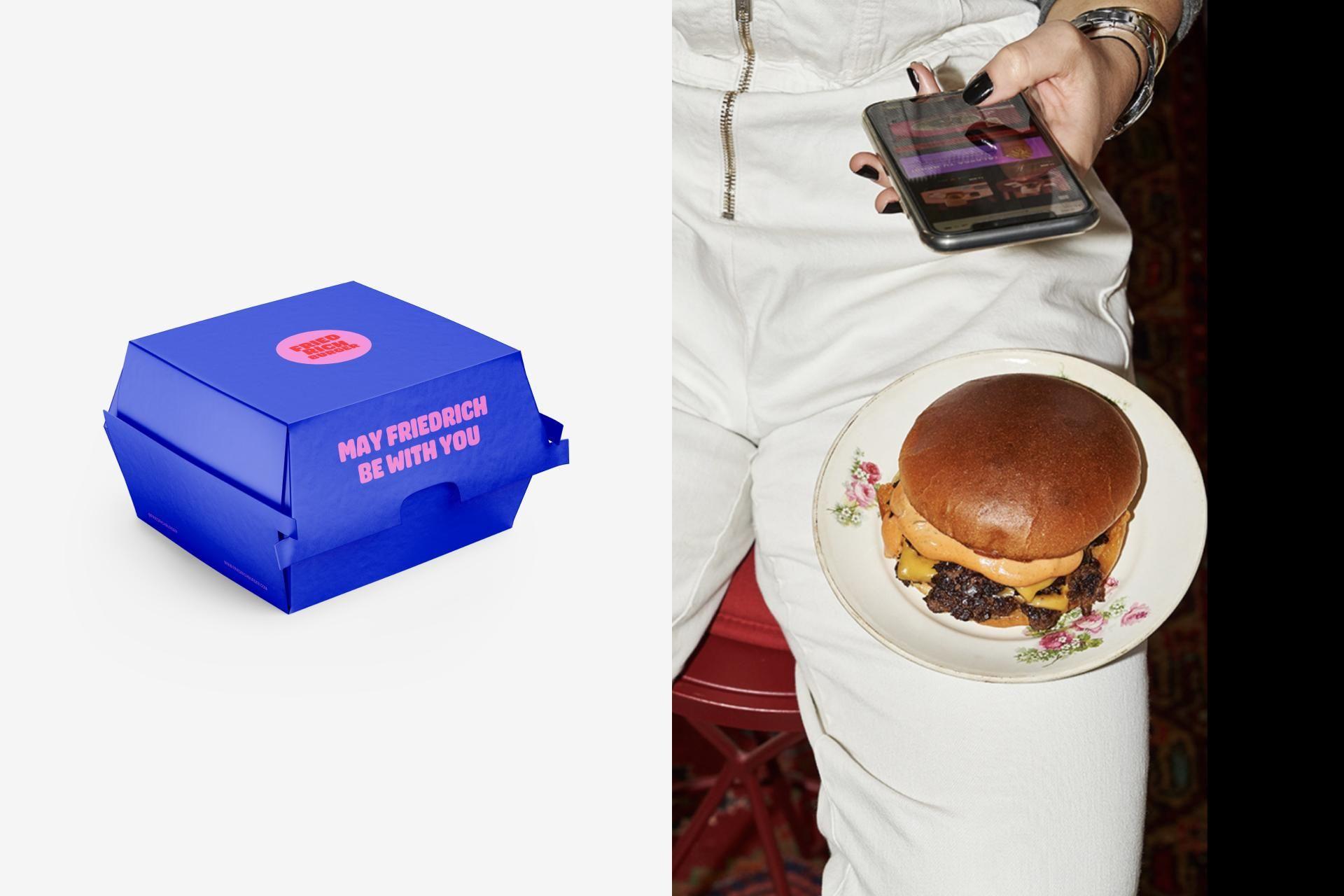 Концепция фирменного стиля была основана на названии самого места. Мы представляли Фридриха слегка эксцентричным человеком, который обожал вкусно поесть и питал особую страсть к бургерам. Очевидно, в его время такого понятия в принципе не существовало, но мы решили интерпретировать это по-своему – Burgerliebe ist eine Liebe zum Essen in Schichten (Любовь к бургерам – это многослойная любовь). Эта идея лежит в основе всего фирменного стиля: от логотипа до причудливых авторских иллюстраций.