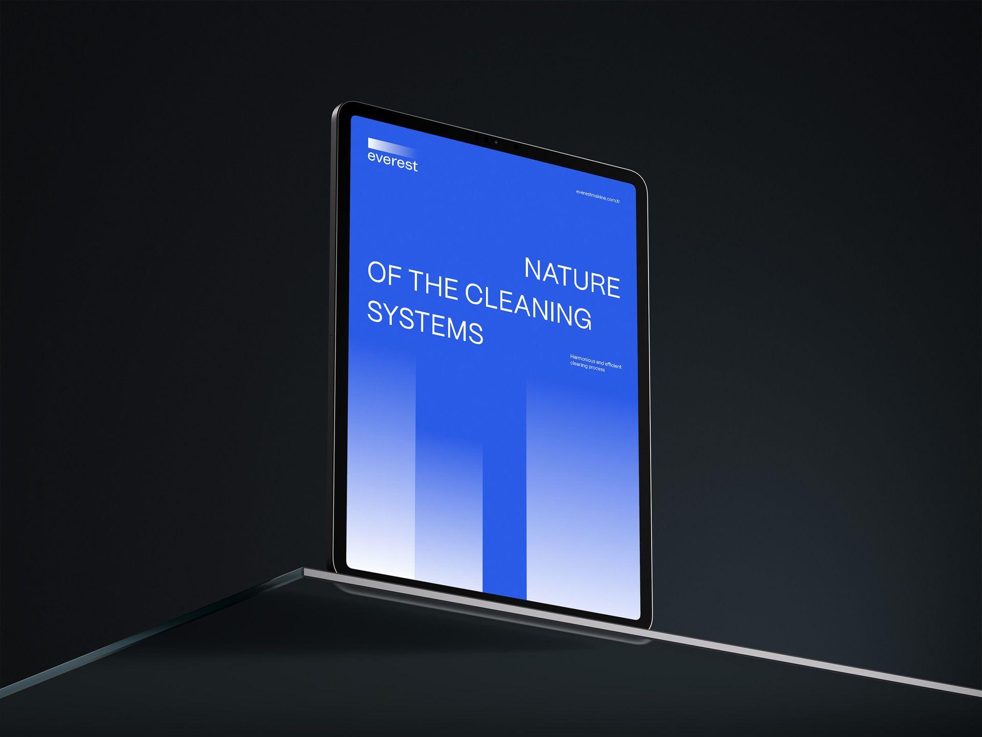Вдохновившись окружающей нас природой, мы создали концепцию фирменного стиля, которая сочетает в себе аллегорию чистоты и минимализма: обтекаемые формы, кристальная чистота воды, оттенки стали и идея цикличности этапов работы клининговых машин.