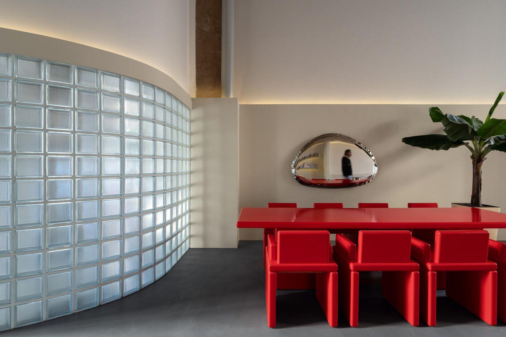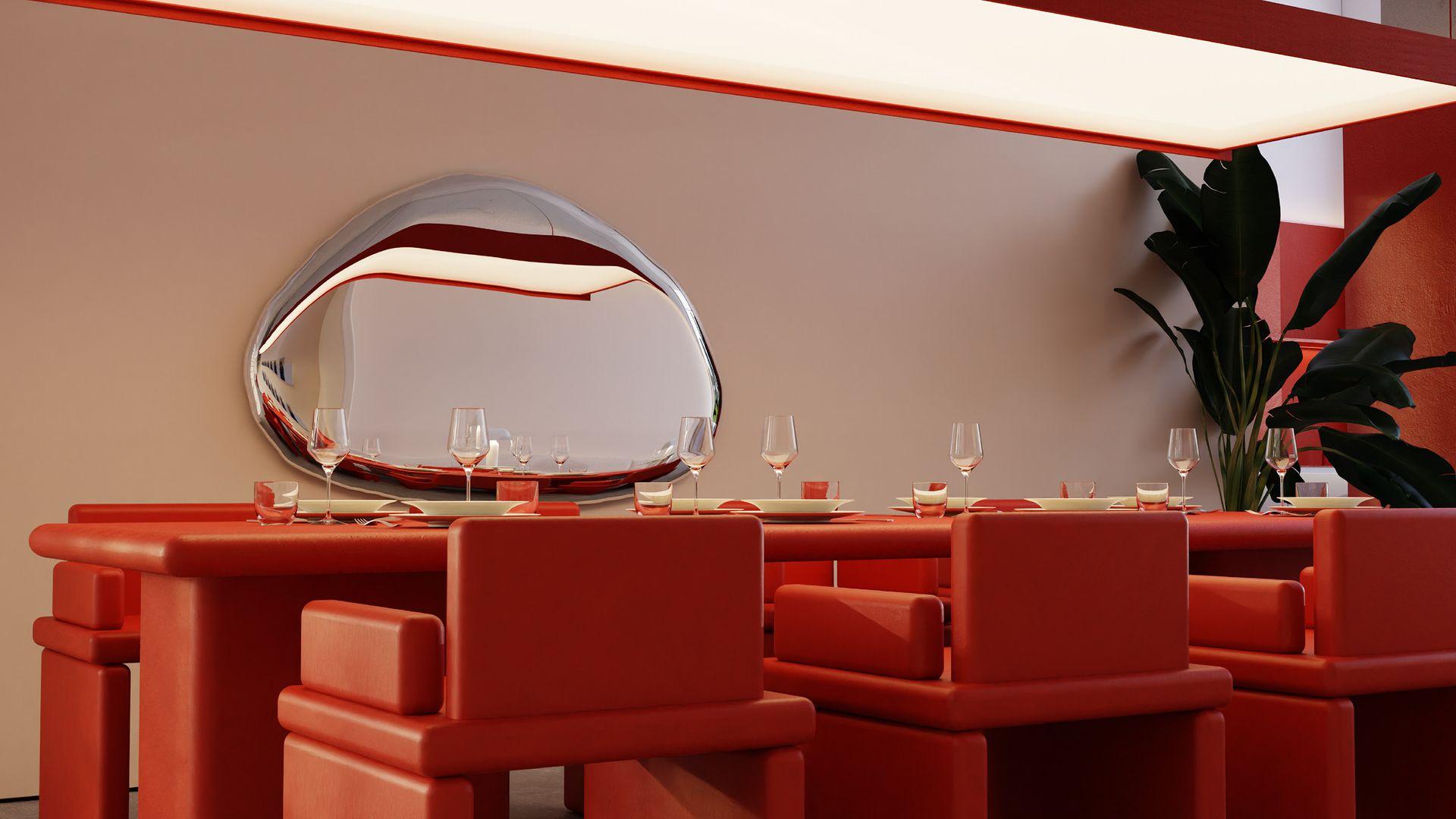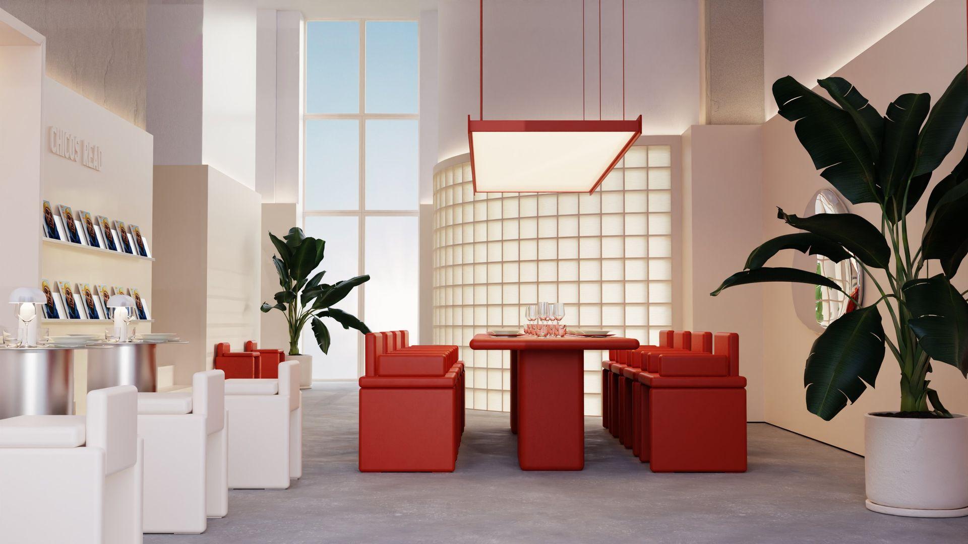 Вдохновившись формой эмпанадас (одного из фирменных блюд в Chicos), мы дополнили фирменный стиль дизайн-элементом похожей формы. Интерьер ресторана также дополняет огромное дутое зеркало польского бренда Zieta Studio, выполненное в схожем стиле.