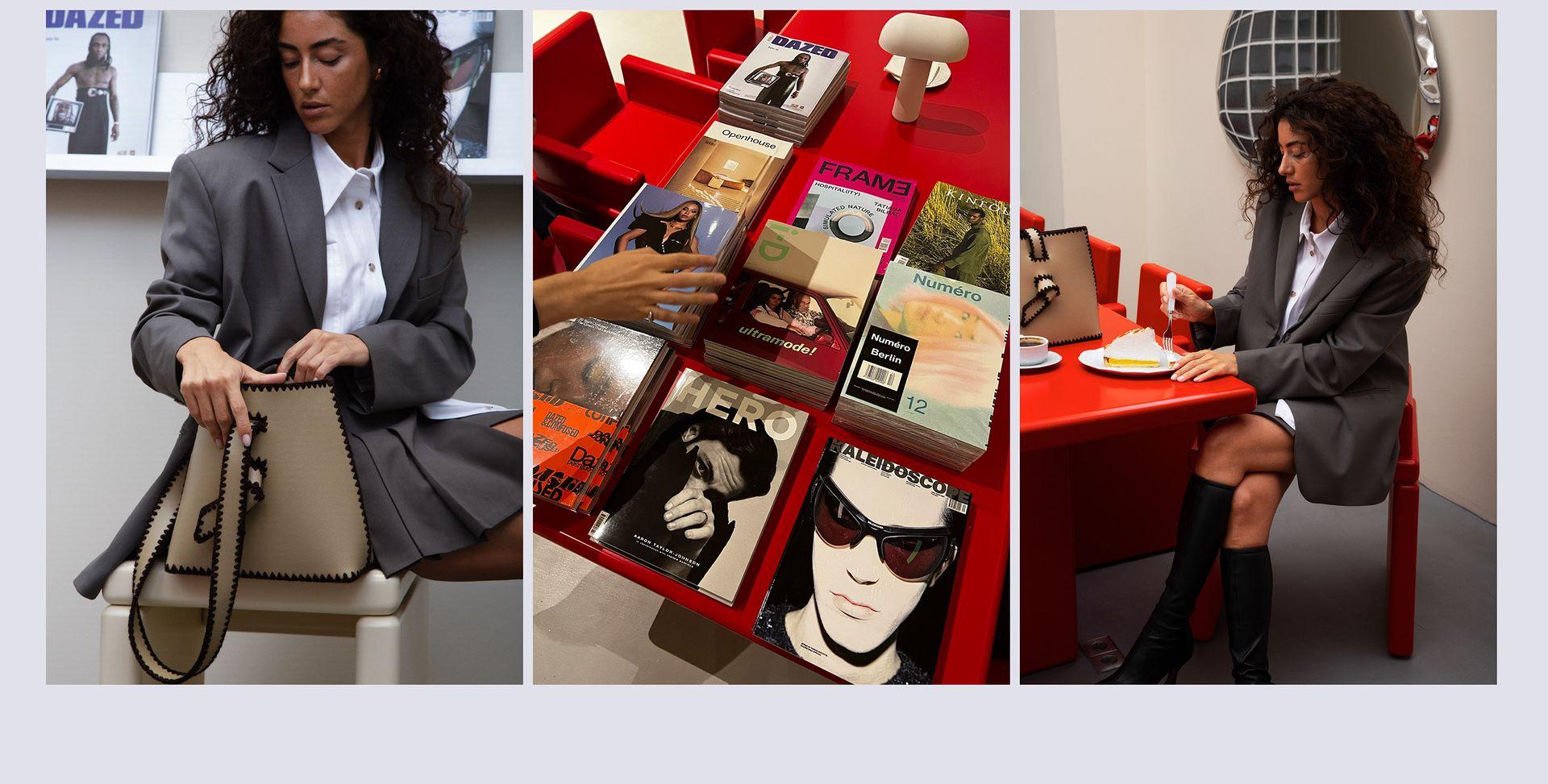 Цветовая палитра спокойная и теплая: пастельно-бежевый и пыльно-розовый дополняются ярко-красным и розовым.