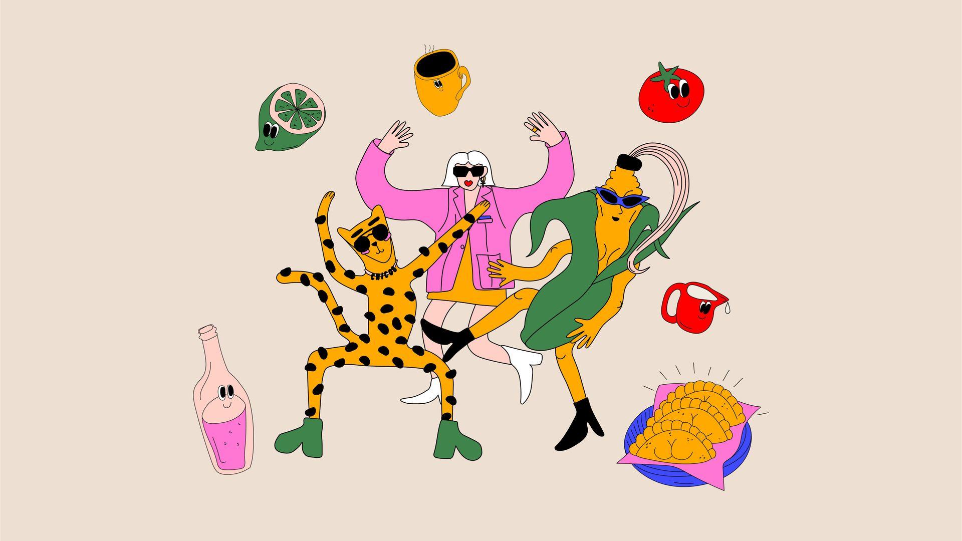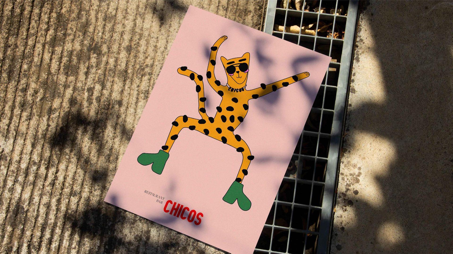 В дополнение к элементам айдентики и 3D-иллюстрациям мы создали серию иллюстраций. Ключевые блюда из меню изображены как живые и забавные персонажи. Среди главных героев – кукуруза, человек и леопард, которые напоминают о разнообразии персонажей в клубе Chicos.
