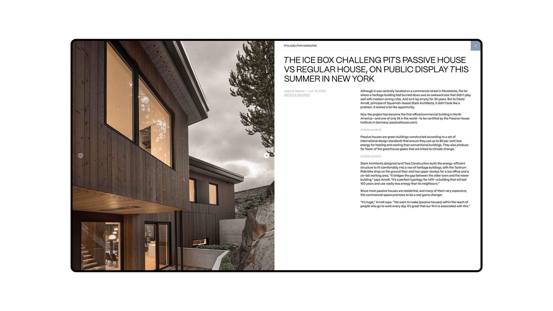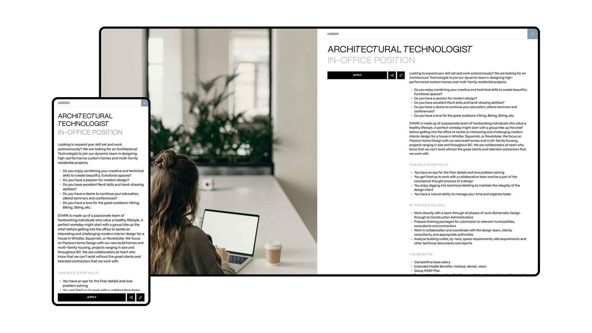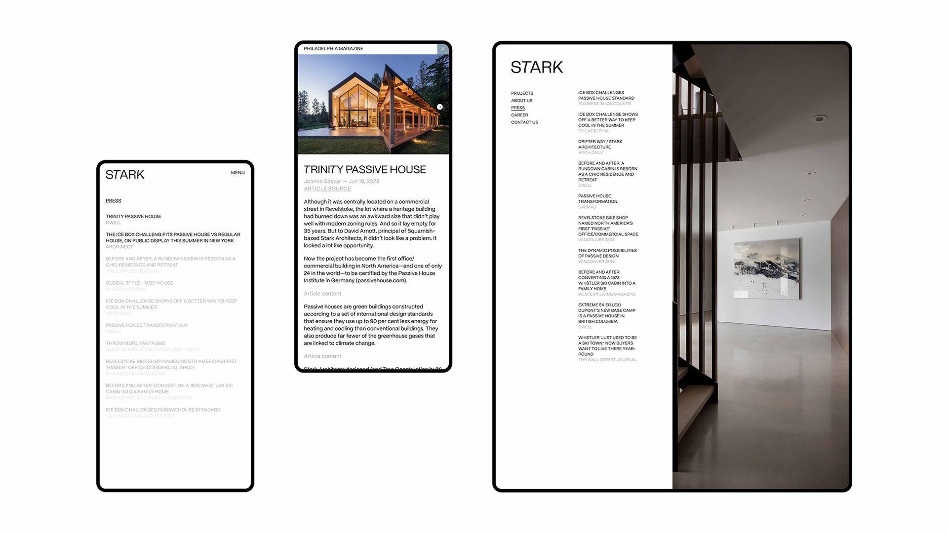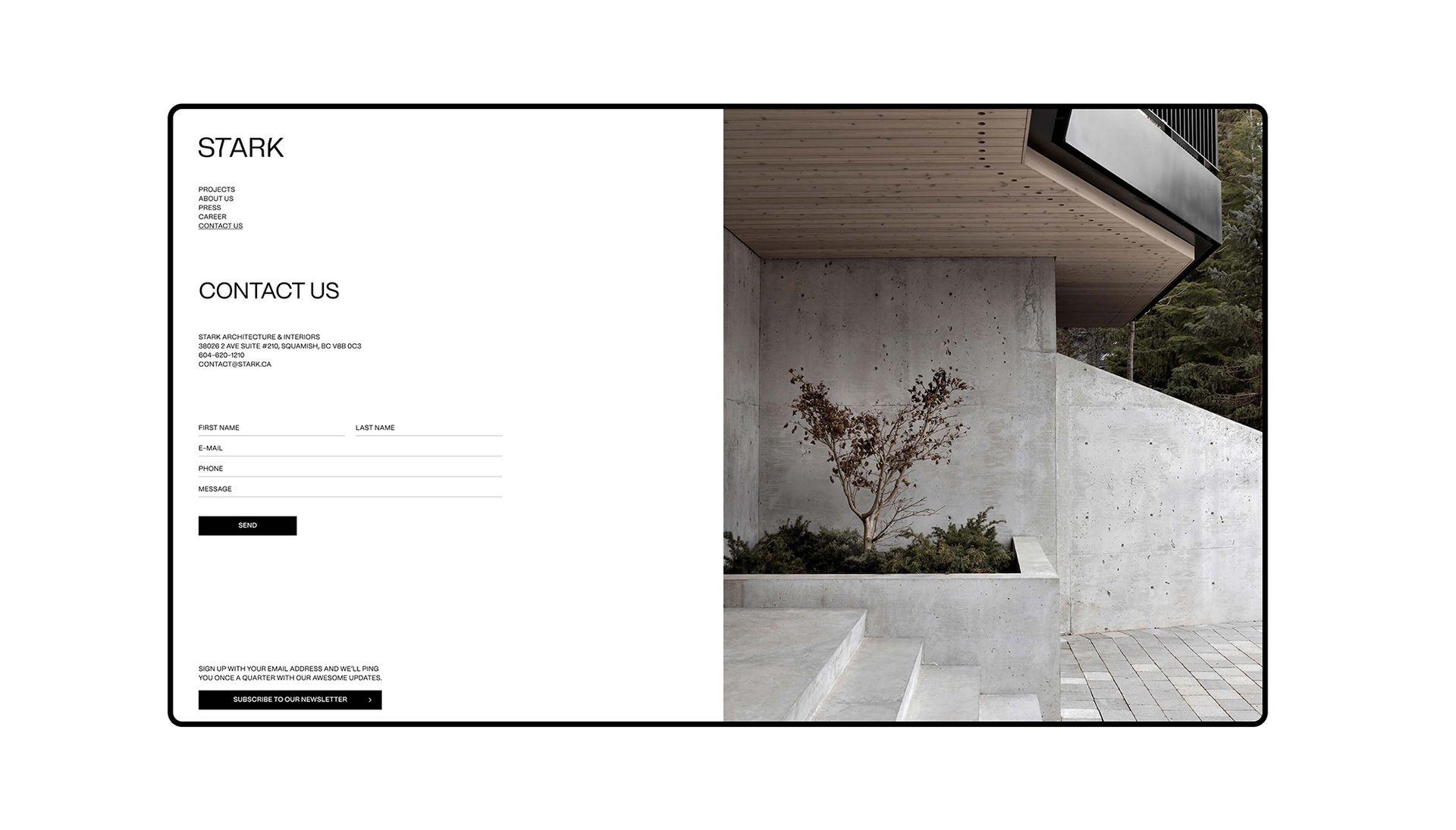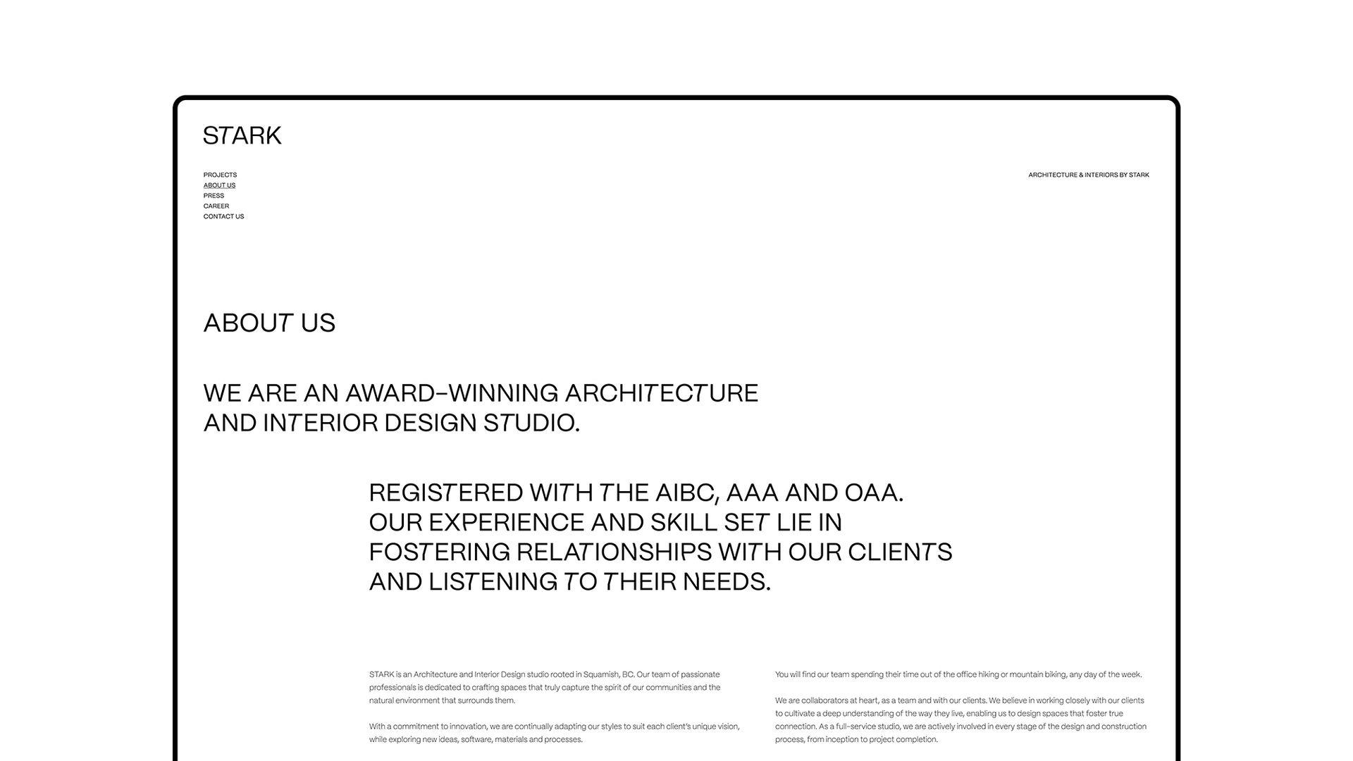 STARK, архитектурная и дизайн-студия, базирующаяся в живописном городе Сквамиш, Канада, обратилась к нам за обновлением их текущего сайта. В дополнение к новой айдентике в качестве первого этапа внедрения бренда мы разработали сайт. Выполненный в соответствии с эстетикой минимализма, он отражает основные ценности бренда, методологию, портфолио и, прежде всего, знакомит нас с командой STARK.