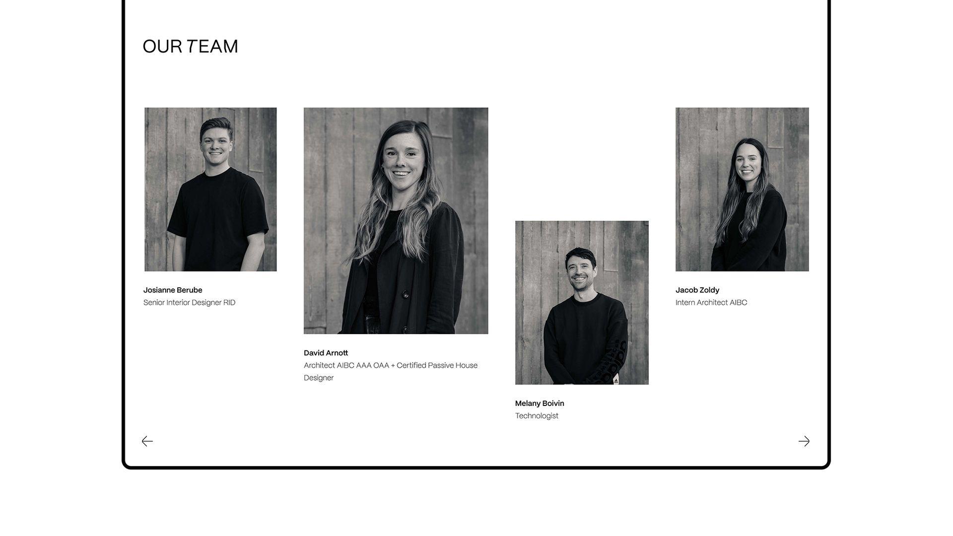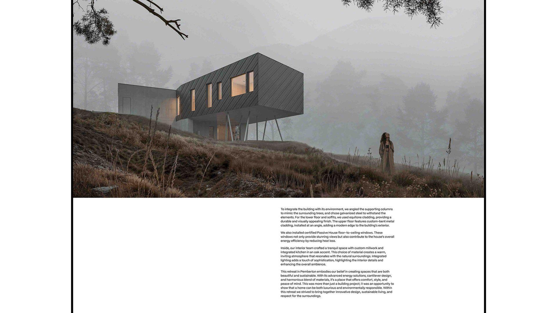 Главная страница сайта отражает суть визуальной идентичности бренда, плавно сочетая мягкий минимализм с архитектурой, вдохновленной природой. На входном экране мы видим один из архитектурных проектов бренда, который погружает нас в захватывающий мир творений, но, наведя курсор на изображение, мы видим чертеж самого здания, дополненный ключевыми сообщениями бренда. Тот же эффект работает и в мобильной версии - главно изображение можно проскроллить, чтобы изменить его. Такой динамичный дизайн отражает стремление бренда к архитектурному совершенству через интуитивно понятную навигацию и удобный доступ к информации о услугах и портфолио.
